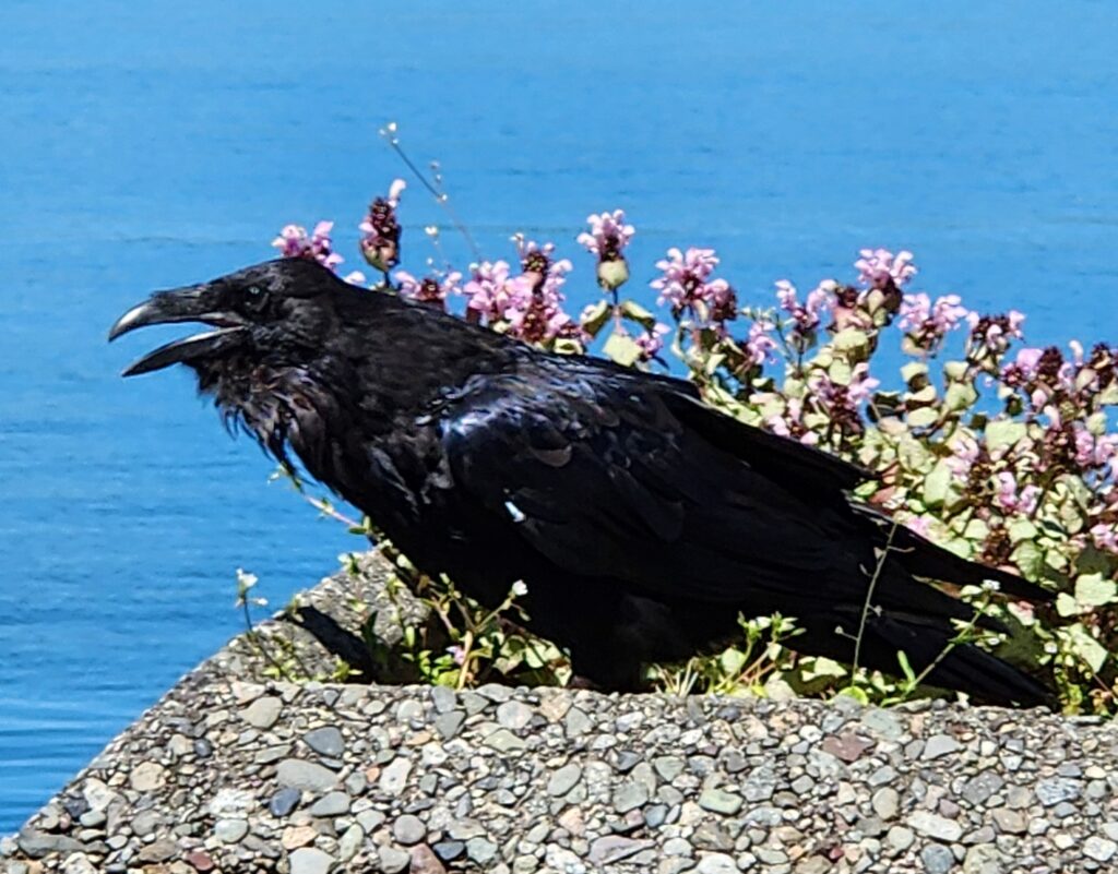 A black crow is perched on a concrete ledge with small pink flowers growing behind it. The background shows a body of blue water.
