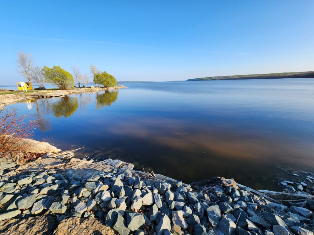 A serene lakeside scene with a rocky shoreline and calm, clear water reflecting the blue sky.
