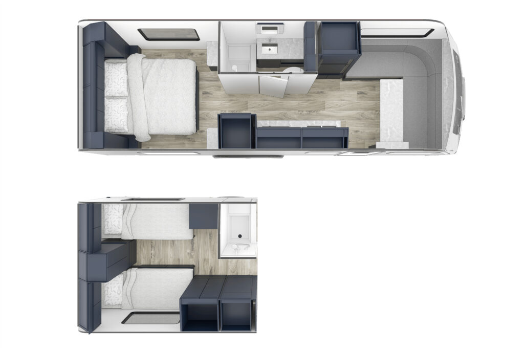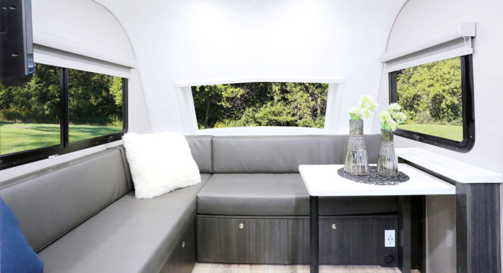 Available in three different floorplans – ranging in length from 25 to 31 feet- each has an interesting feature: a queen bed or interchangeable singles available in each floorplan. With the ability to sleep up to four – a small family would consider this trailer – however, with the twin singles, it seems there is a nod to couples – typically older couples (sorry kids, we kind of like to sleep alone as we age) appears to be the builder intent. These three trailers also land nicely in the half-ton/full-size SUV tow range. As for electricity – the company website goes on to cover the possibility of towing with an EV, as this, too, is a new reality.